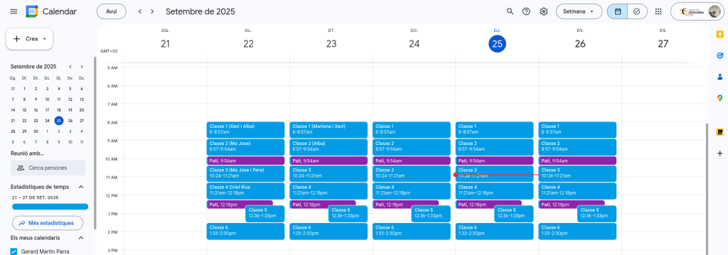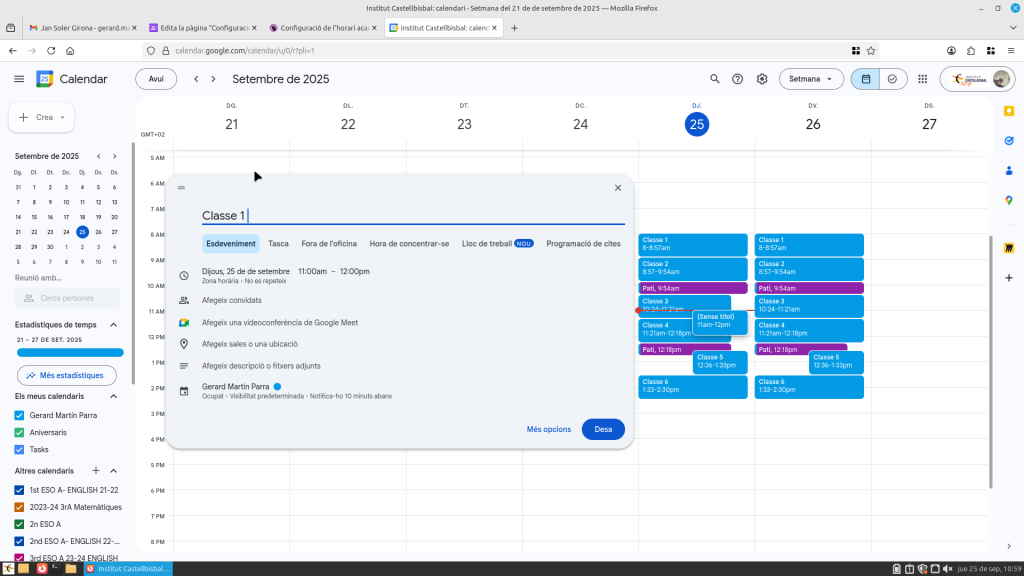 Vaig fer el meu horari de classe a google calendar per poder organitzar-me be i saber el que em toca a cada hora he posat els nombres de els professors.