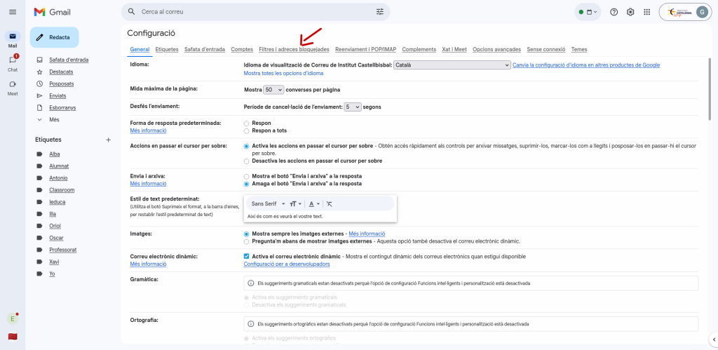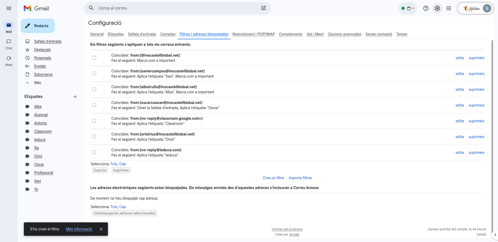 Per exemple, jo, personalment, tinc configurat un filtre perquè tots els correus que em vagin arribant amb l’adreça @inscastellbisbal.net es marquin automàticament com a “Importants”.