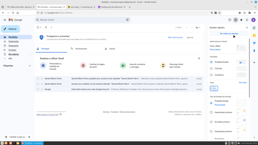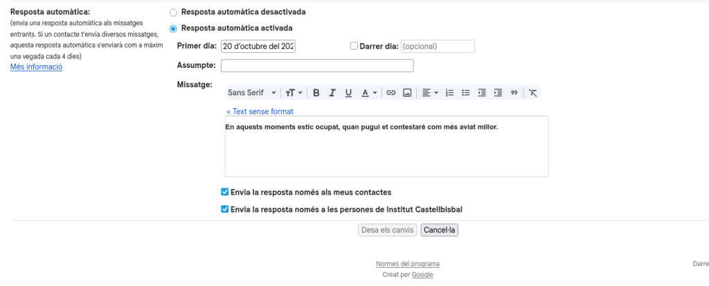 A Gmail, ves a la configuració i, un cop hi siguis, entra a la secció general. A baix de tot trobaràs una secció que diu ‘Resposta automàtica’ i allà hi pots posar la resposta que vulguis.