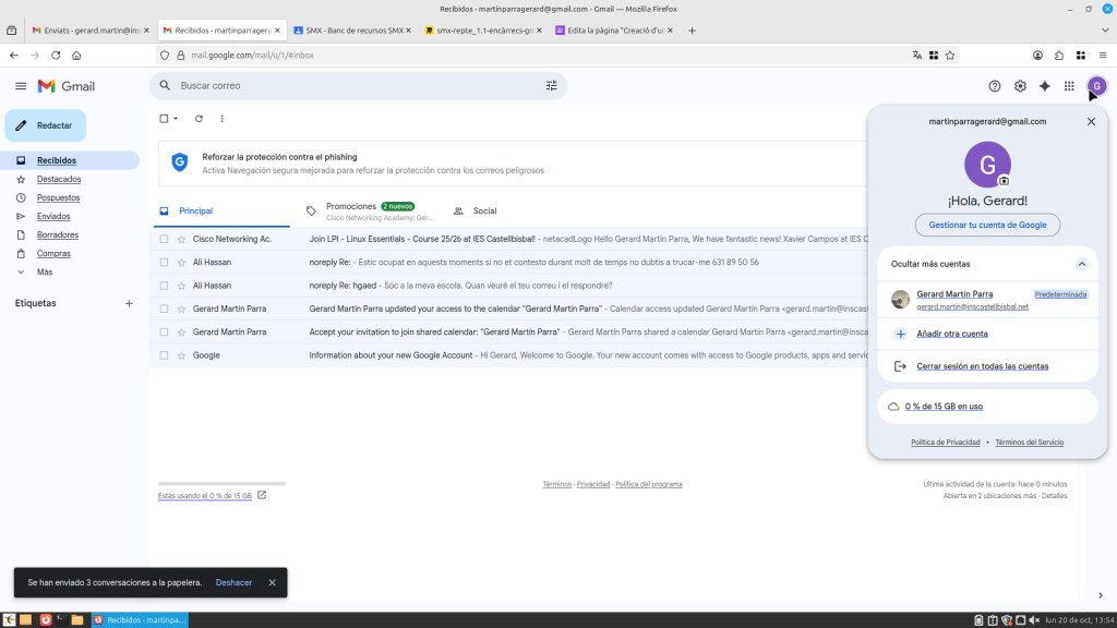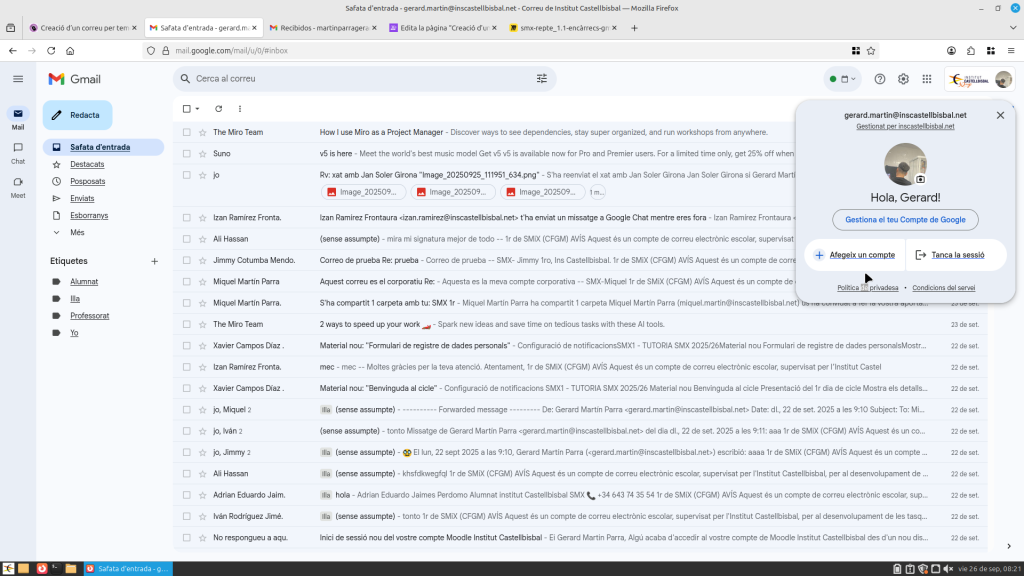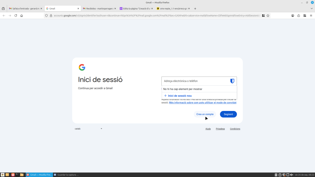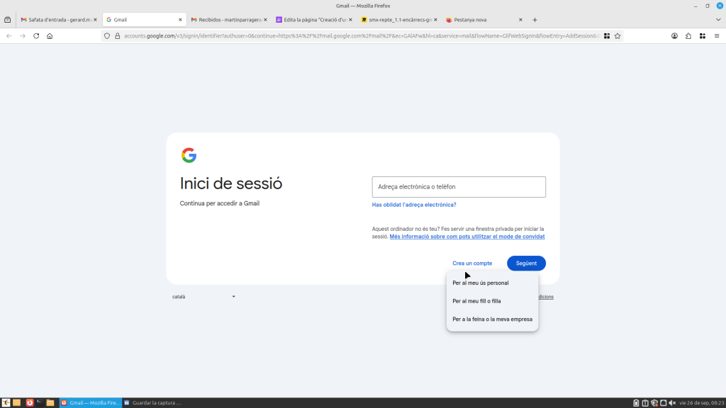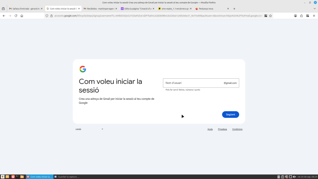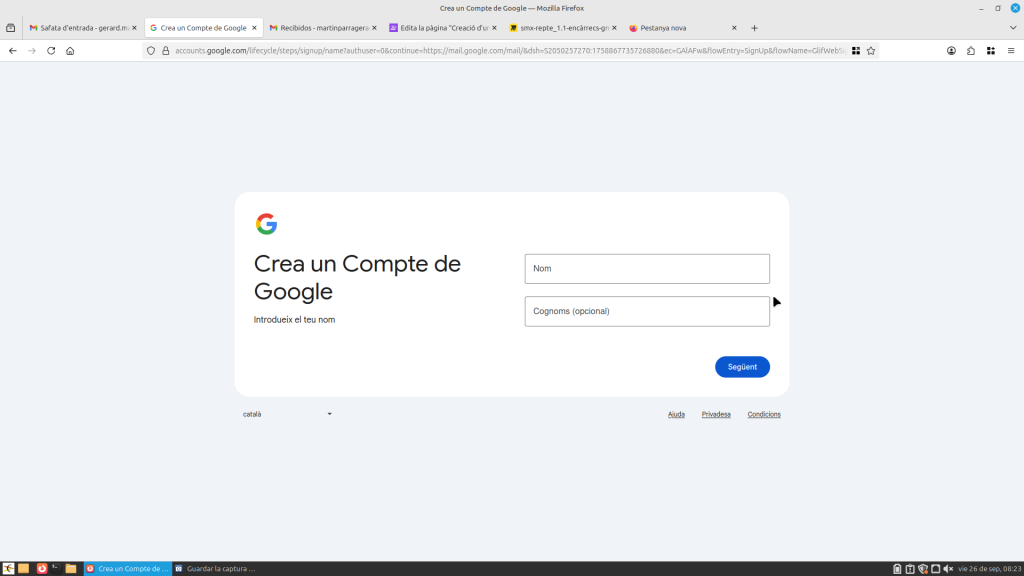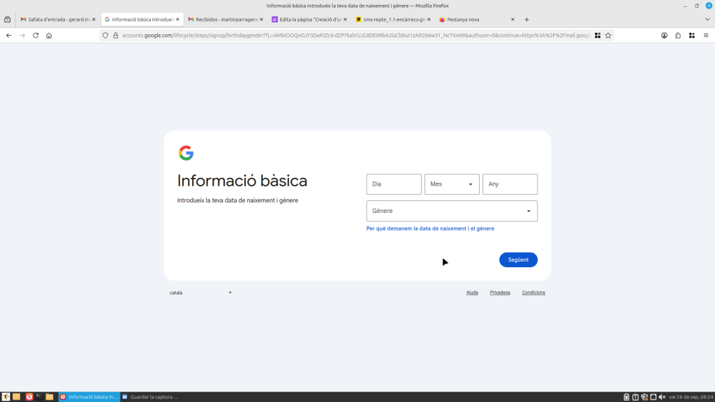 Obres Gmail a la part superior a la dreta, et sortirà al teu compte. Si li dones, et surt un apartat on posa “afegir un compte”. Li dones i tot seguit baixes a “crear un compte”. Pots triar el compte per al teu ús personal, per a fill o filla, i per treballar o per a la teva empresa. Seguit, t’enviarà a una altra pàgina on hauràs de posar el teu nom i cognom, després el teu nom i cognom, i després et demanarà la data de naixement i el teu gènere. Seguidament, podràs editar la teva adreça com vulguis.
