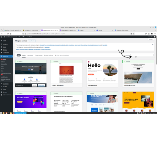 Entra a WordPress, inicia sessió com a administrador, ves a Aparença, allà a baix et sortirà l’opció Afegir un tema, hi fas clic i després, a la part superior dreta, et sortirà un cercador on posaràs el nom del tema que estàs buscant.