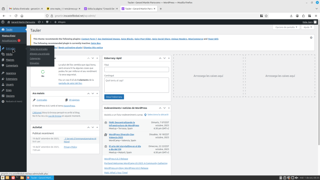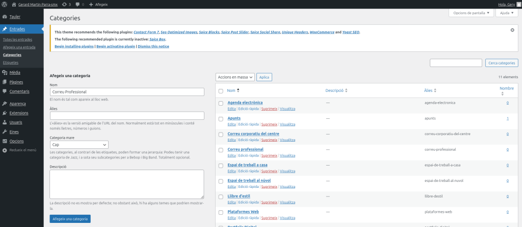 Ves a WordPress, a la part superior esquerra et sortirà un apartat que posa Entrades i se’t desplegarà un apartat que posa Categories. Hi cliques i veuràs que et demanarà un nom per a la teva nova categoria. Després de posar el nom, li dones a Afegeix una categoria i ja tindràs la teva categoria creada.