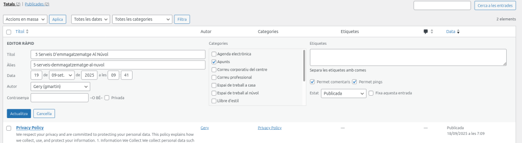 Després, per veure-les i assignar-les, ves a Entrades i, a les entrades que tinguis, clica a Edició ràpida, i veuràs totes les categories que has creat.