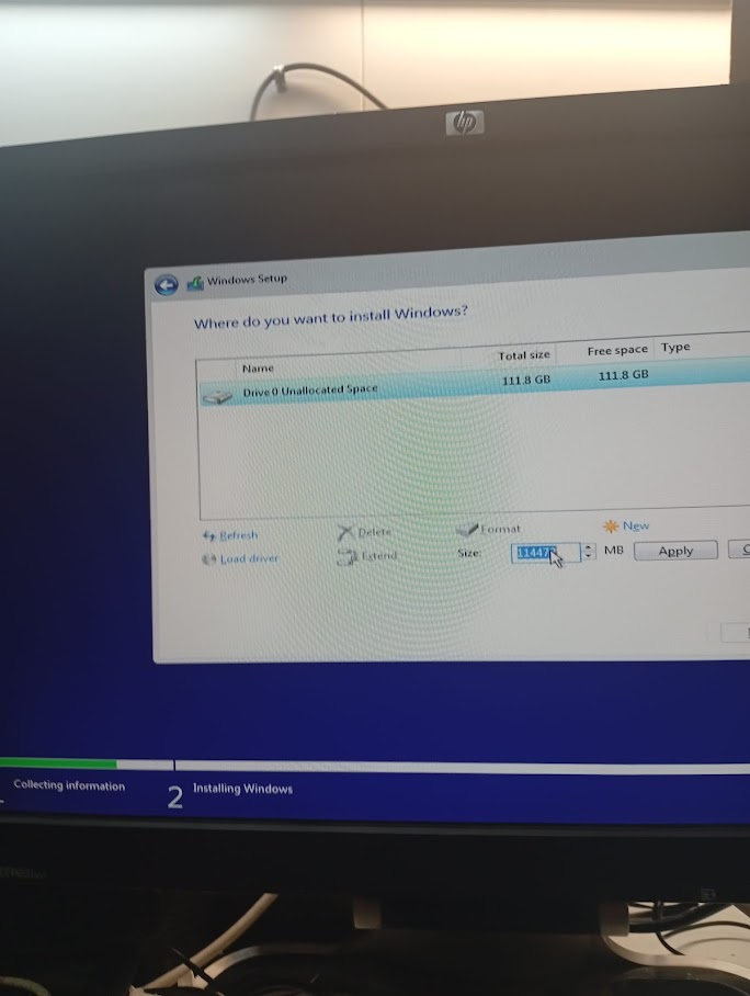 Preparar l’espai del disc : Aquesta és la part on hem decidit on s’instal·larà tot. Hem fet clic a “New” (Nou) per crear una partició nova al disc dur de 111.8 GB.