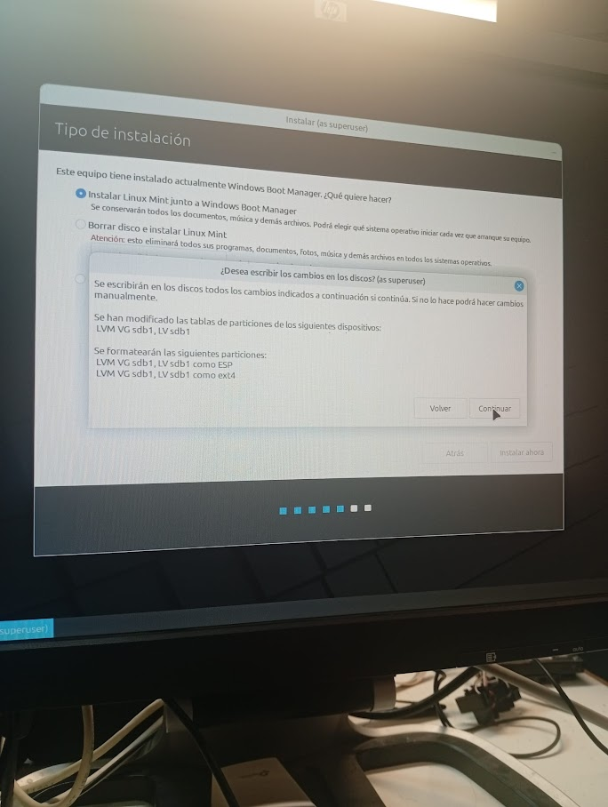 Triar el lloc (Tipus d’instal·lació): Aquesta és la part clau. Hem triat l’opció “Instal·lar Linux Mint al costat de Windows Boot Manager”. Això fa que el Linux s’instal·li sense esborrar el Windows que ja havíem posat abans. Així tenim els dos sistemes a la vegada.