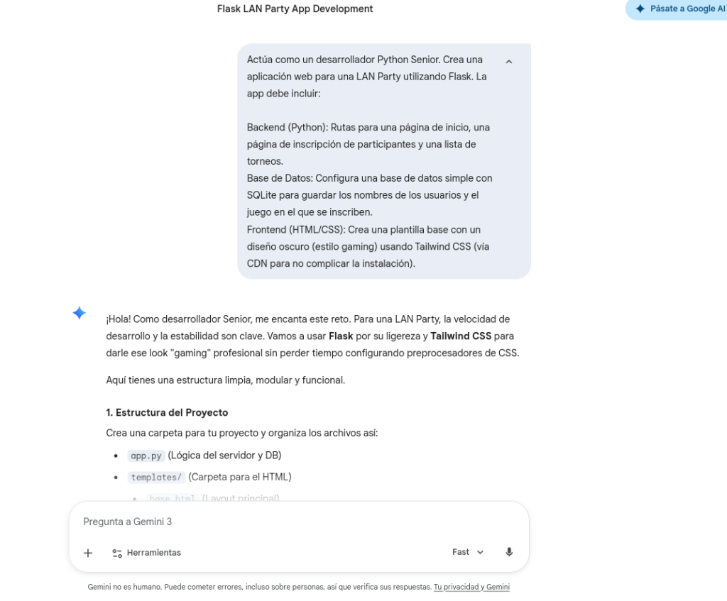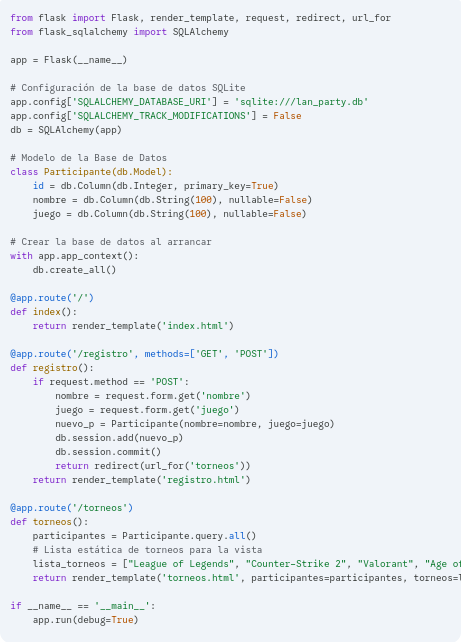 Actúa como un desarrollador Python Senior. Crea una aplicación web para una LAN Party utilizando Flask. La app debe incluir: