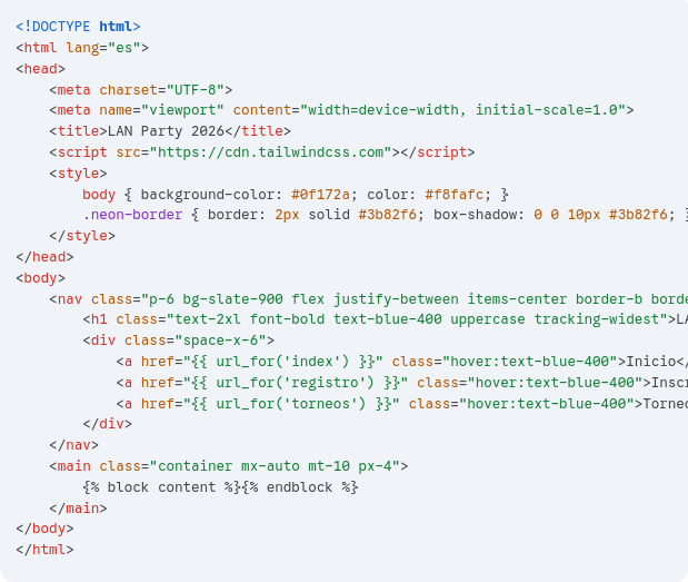 - Frontend (HTML/CSS): Crea una plantilla base con un diseño oscuro (estilo gaming) usando Tailwind CSS (vía CDN para no complicar la instalación).